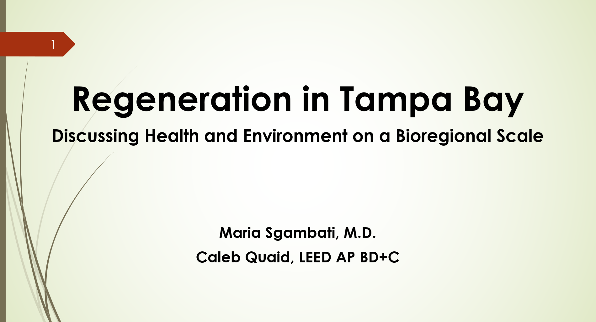 Maria Sgambati, M.D. and Caleb Quaid, LEED AP BD+C share a presentation to the Resilient Land Use Working Group with the Tampa Bay Regional Planning Council. Presentation discusses regenerative ideas, impacts on health, and how we can frame the conversation at different scales, including the scale of bioregional regeneration.